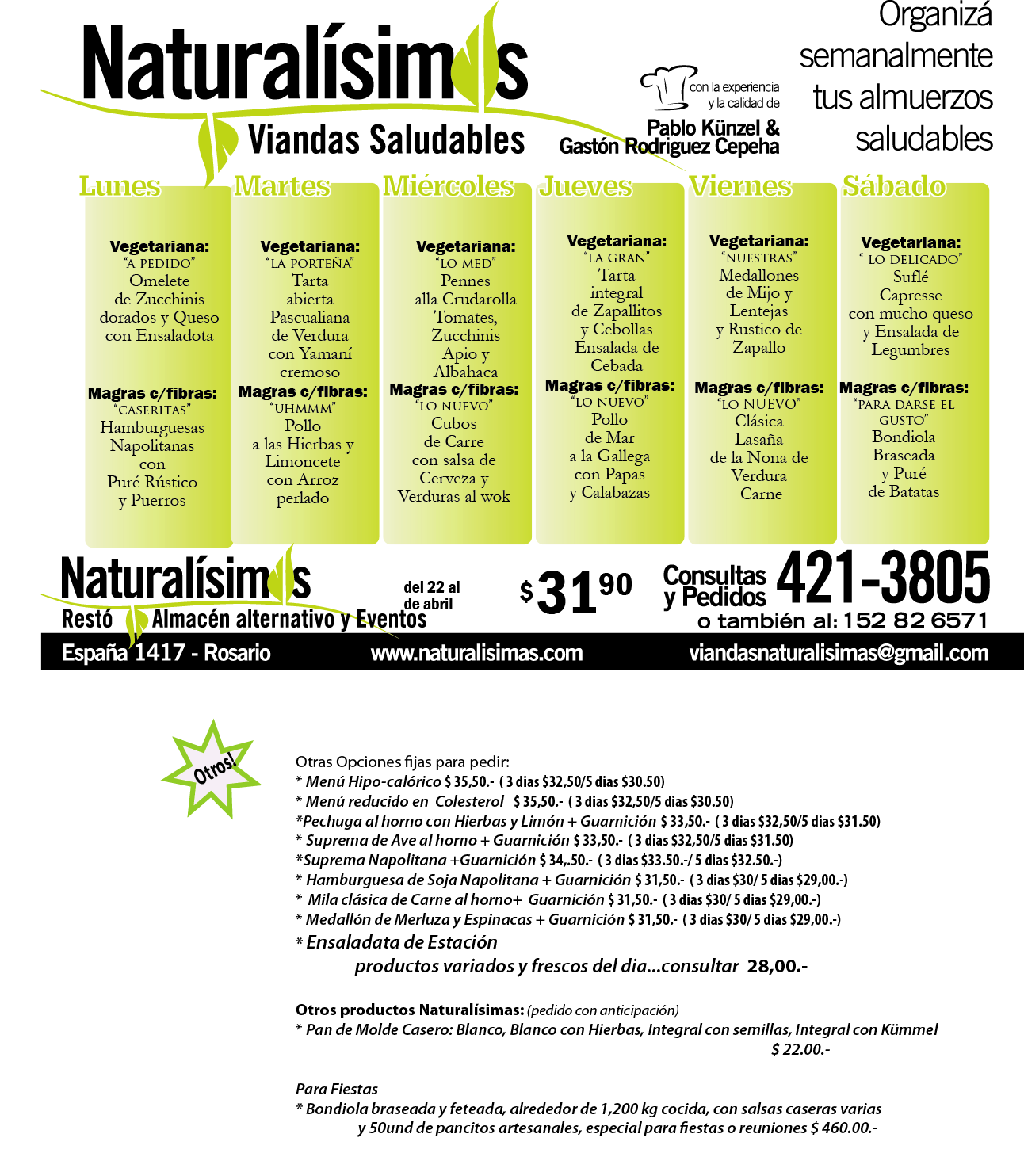 Uncategorized Menú del 22 al 27 de Abril Publicado por Naturalisimas el abril 18, 2013 Menú NATURALISIMAS «Somos lo que comemos» viandasnaturalisimas@gmail.com Comparte esto: Compartir en X (Se abre en una ventana nueva) X Comparte en Facebook (Se abre en una ventana nueva) Facebook Me gusta Cargando... Relacionado
