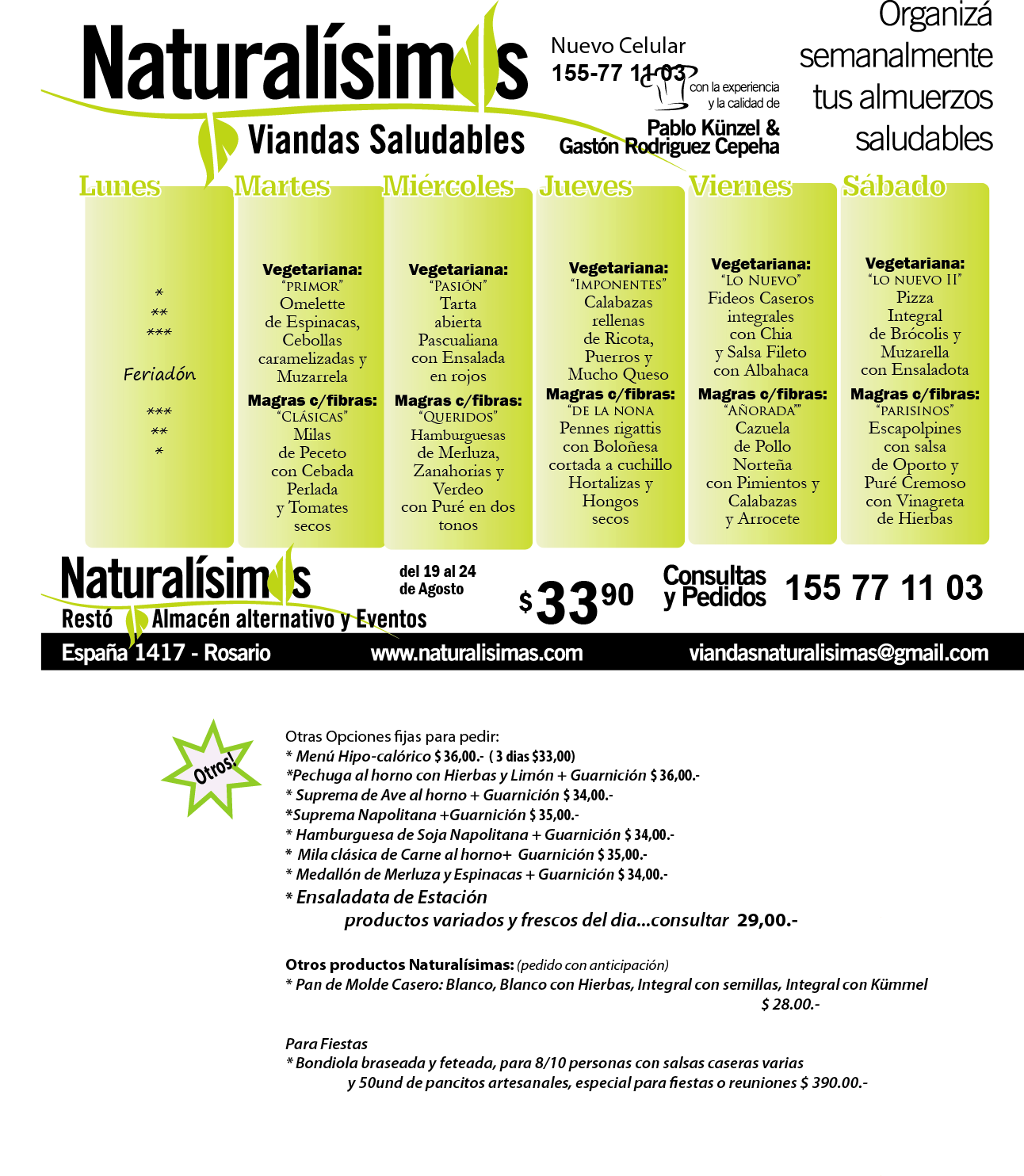 Menú Menú del 19 al 24 de Agosto Publicado por Naturalisimas el agosto 15, 2013 NUEVO TELÉFONO 155 -77 11 03 Bienvenido Invierno !! «Somos lo que comemos» viandasnaturalisimas@gmail.com Comparte esto: Haz clic para compartir en X (Se abre en una ventana nueva) X Haz clic para compartir en Facebook (Se abre en una ventana nueva) Facebook Me gusta Cargando... Relacionado