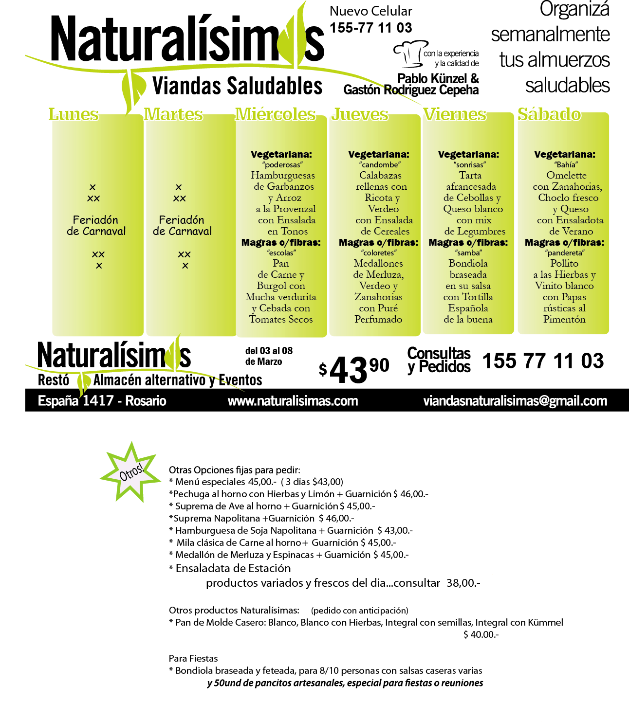 Menú Menú del 03 al 08 de Marzo Publicado por Naturalisimas el febrero 27, 2014 NUEVO TELÉFONO 155 -77 11 03 Llegan los Jueves de Talleres Degustativos !!! «Somos lo que comemos» viandasnaturalisimas@gmail.com Comparte esto: Haz clic para compartir en X (Se abre en una ventana nueva) X Haz clic para compartir en Facebook (Se abre en una ventana nueva) Facebook Me gusta Cargando... Relacionado
