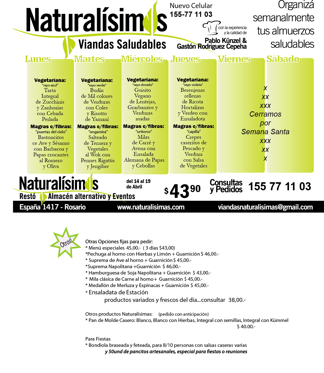 Menú Menú del 14 al 19 de Abril Publicado por Naturalisimas el abril 10, 2014 NUEVO TELÉFONO 155 -77 11 03 Llegan los Jueves de Talleres Degustativos !!! «Una elección de vida « viandasnaturalisimas@gmail.com Comparte esto: Haz clic para compartir en X (Se abre en una ventana nueva) X Haz clic para compartir en Facebook (Se abre en una ventana nueva) Facebook Me gusta Cargando... Relacionado