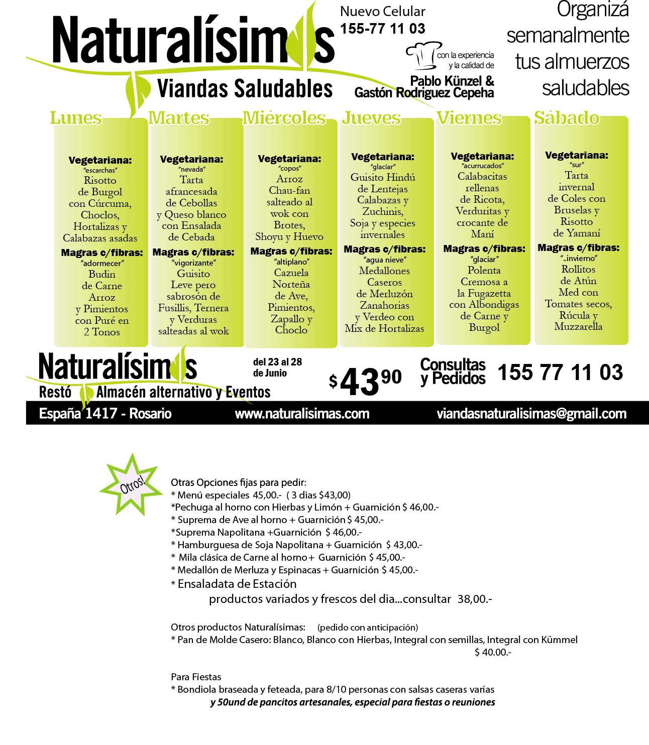 Menú Menú del 23 al 28 de Junio Publicado por Naturalisimas el junio 19, 2014 NUEVO TELÉFONO 155 -77 11 03 «Una elección de vida « La familia se agranda… en Julio llega NATURALÍSIMAS FUNES … con nuestros mediodías de siempre + la gran noche !!!!! viandasnaturalisimas@gmail.com Comparte esto: Compartir en X (Se abre en una ventana nueva) X Comparte en Facebook (Se abre en una ventana nueva) Facebook Me gusta Cargando... Relacionado