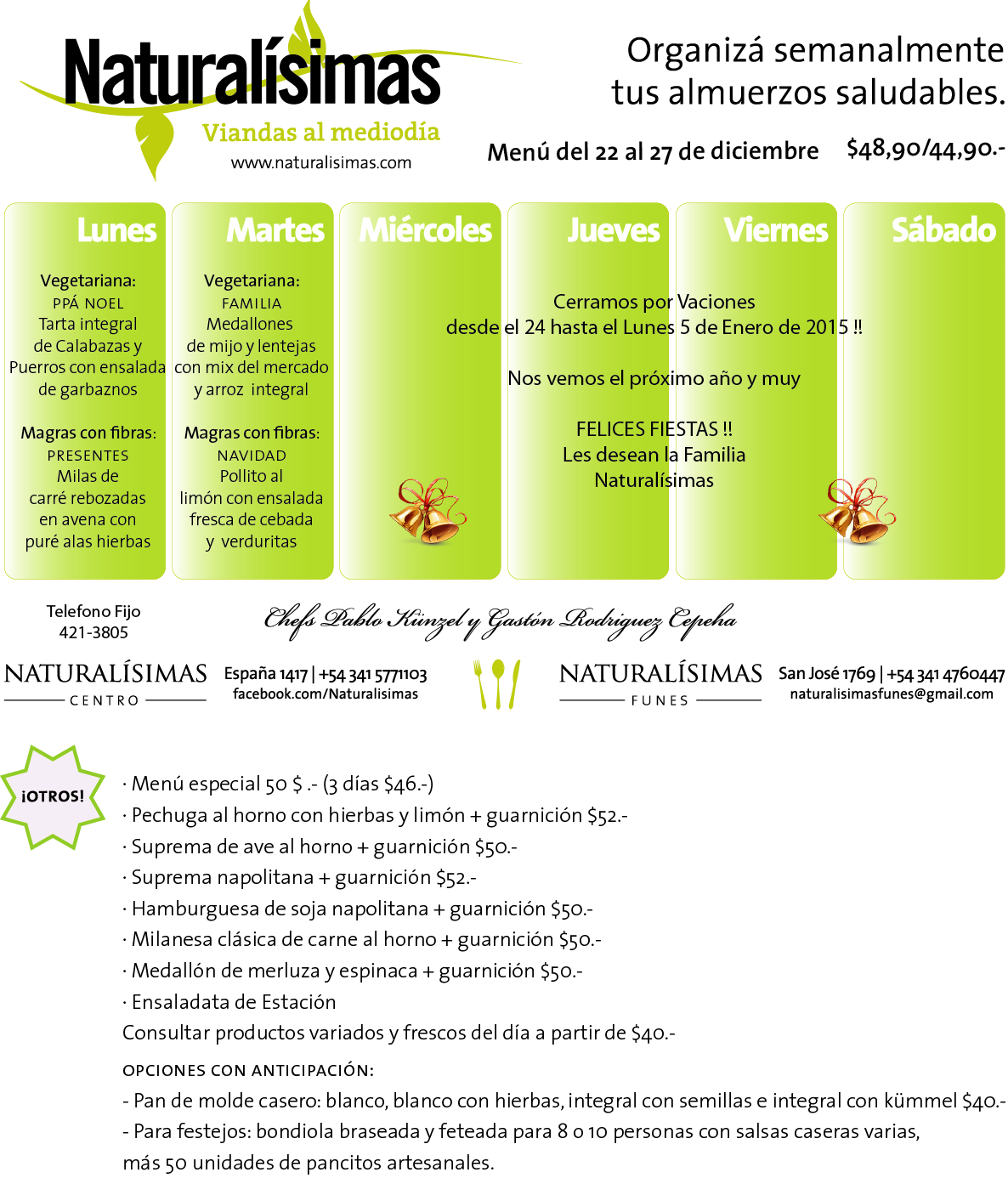 Informamos a nuestros clientes que Naturalísimas Centro, el servicio de viandas permanecerá cerrado por vacaciones desde el 24 de diciembre hasta el domingo 04 de enero , retomando nuestro servicio el 05 y el restaurante Naturalísimas Centro hasta el 12 de enero. Naturalísimas Funes abrirá sus puertas el viernes 26 y sábado 27 como lo hace a menudo. Gracias