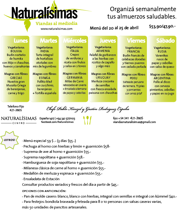 Menú Menú del 20 al 25 de abril Publicado por Naturalisimas el abril 16, 2015 «Rica, Muy Rica inaugura 8 de mayo!!! « Naturalísimas Centro 421-3805 / 155-771103 España 1417 – Rosario Lunes a sábados de 08 a 15 hs viandasnaturalisimas@gmail.com Comparte esto: Haz clic para compartir en X (Se abre en una ventana nueva) X Haz clic para compartir en Facebook (Se abre en una ventana nueva) Facebook Me gusta Cargando... Relacionado