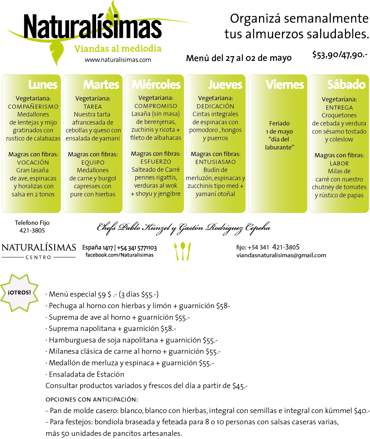 Menú Menú del 26 al 02 de mayo Publicado por Naturalisimas el abril 23, 2015 «Rica, Muy Rica inaugura 8 de mayo!!! « Naturalísimas Centro 421-3805 / 155-771103 España 1417 – Rosario Lunes a sábados de 08 a 15 hs viandasnaturalisimas@gmail.com Comparte esto: Haz clic para compartir en X (Se abre en una ventana nueva) X Haz clic para compartir en Facebook (Se abre en una ventana nueva) Facebook Me gusta Cargando... Relacionado
