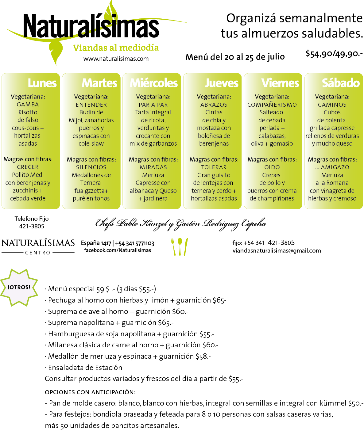 Menú Menú amigazo del 20 al 25 de julio Publicado por Naturalisimas el julio 17, 2015julio 18, 2015 «Rica, Muy Rica dejate tentar …..» Naturalísimas Centro 421-3805 / 155-771103 España 1417 – Rosario Lunes a sábados de 08 a 15 hs viandasnaturalisimas@gmail.com Comparte esto: Haz clic para compartir en X (Se abre en una ventana nueva) X Haz clic para compartir en Facebook (Se abre en una ventana nueva) Facebook Me gusta Cargando... Relacionado