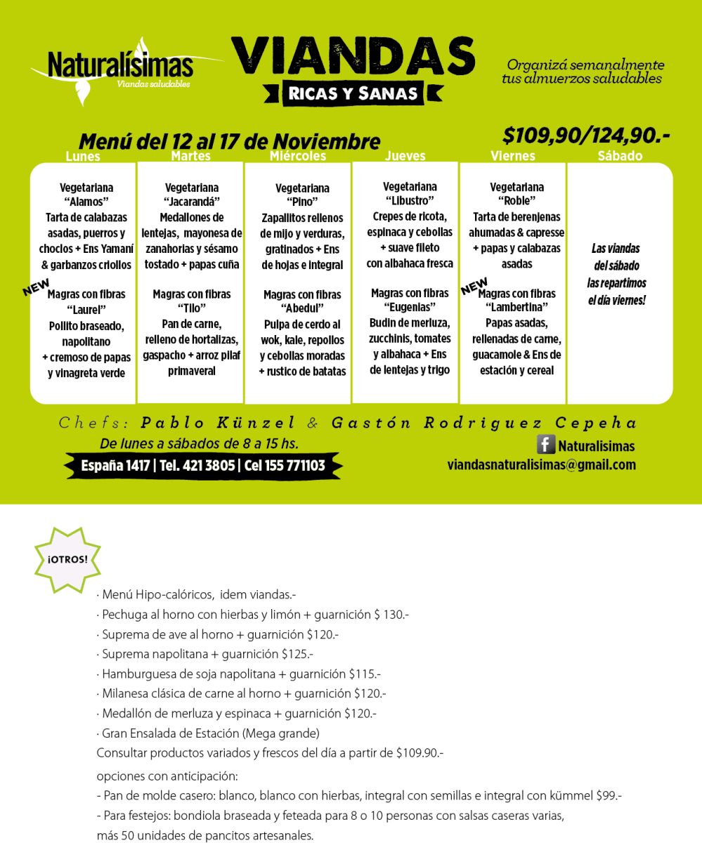 Naturalísimas Centro 421-3805 / 155-771103 España 1417 - Rosario Lunes a sábados de 08 a 15 hs viandasnaturalisimas@gmail.com Facebook Naturalísimas Instagram Naturalísimas