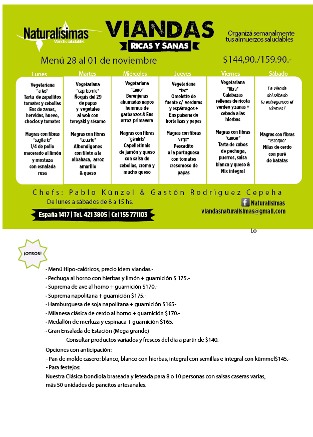 RECORDAR MUY IMPORTANTE: Los pedidos del día lunes los recepcionamos hasta el sábado a la mañana, sino queda sujetos  a disponibilidad de menú y precio de lista. Gracias
