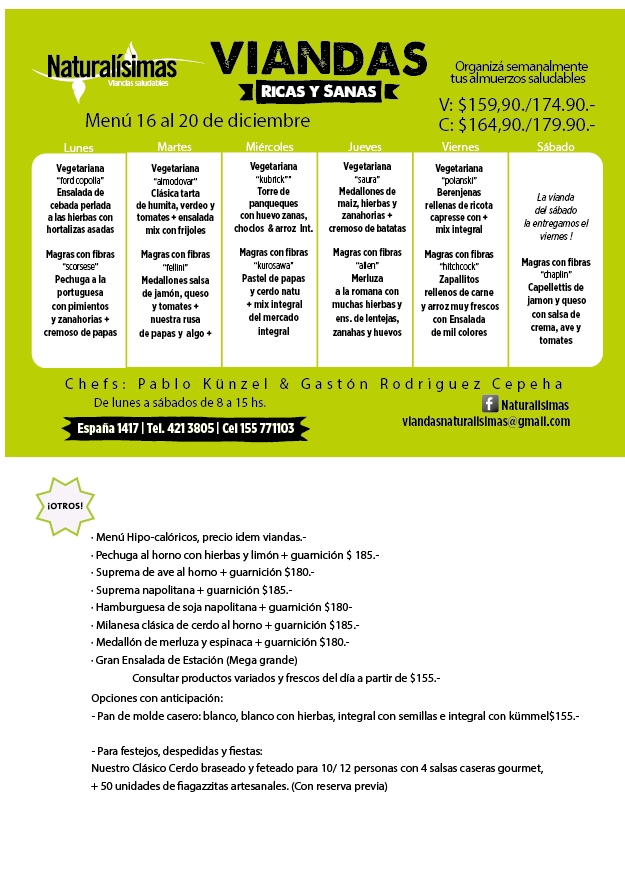 RECORDAR MUY IMPORTANTE: Los pedidos del día lunes los recepcionamos hasta el sábado a la mañana, sino queda sujetos a disponibilidad de menú y precio de lista. Gracias