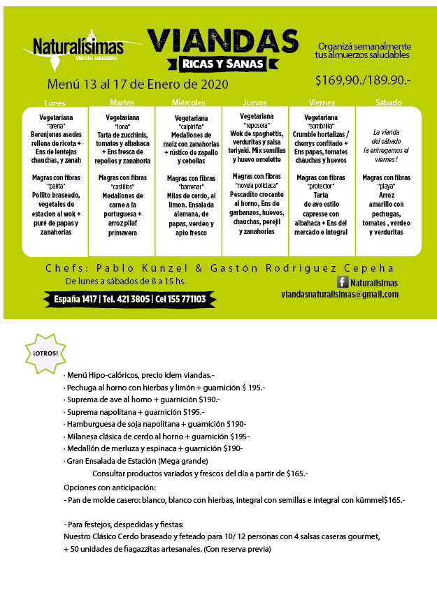 RECORDAR MUY IMPORTANTE: Los pedidos del día lunes los recepcionamos hasta el sábado a la mañana, sino queda sujetos  a disponibilidad de menú y precio de lista. Gracias